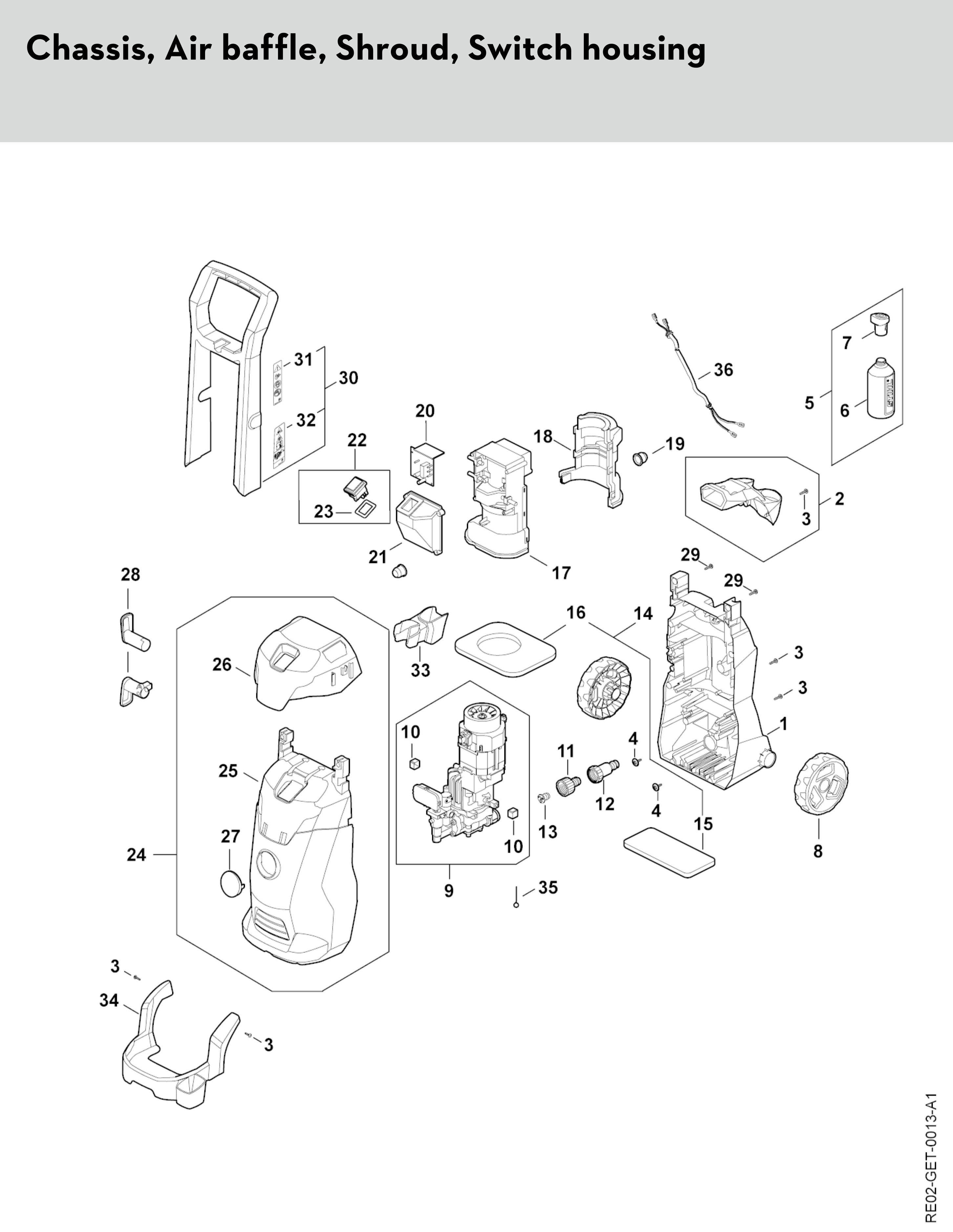 Chassis, Air baffle, Shroud, Switch housing