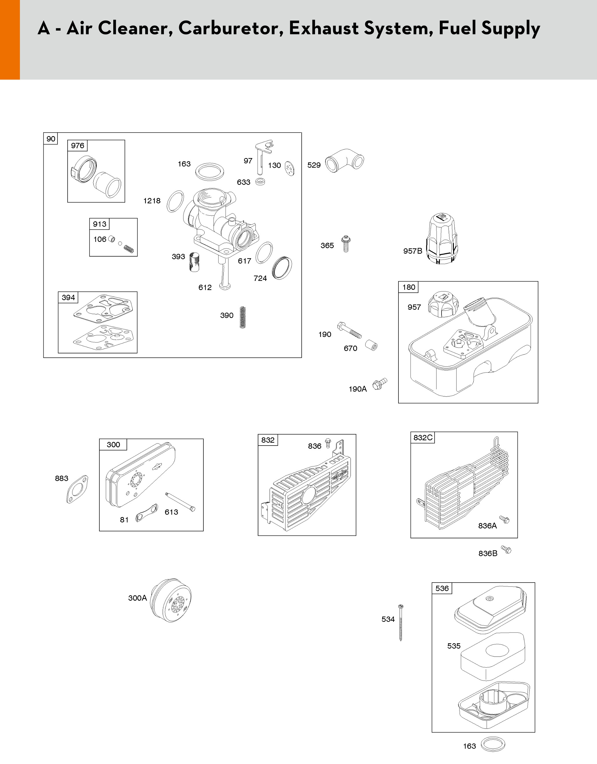 A - Air cleaner, Carburetor, Exhaust system, Fuel supply